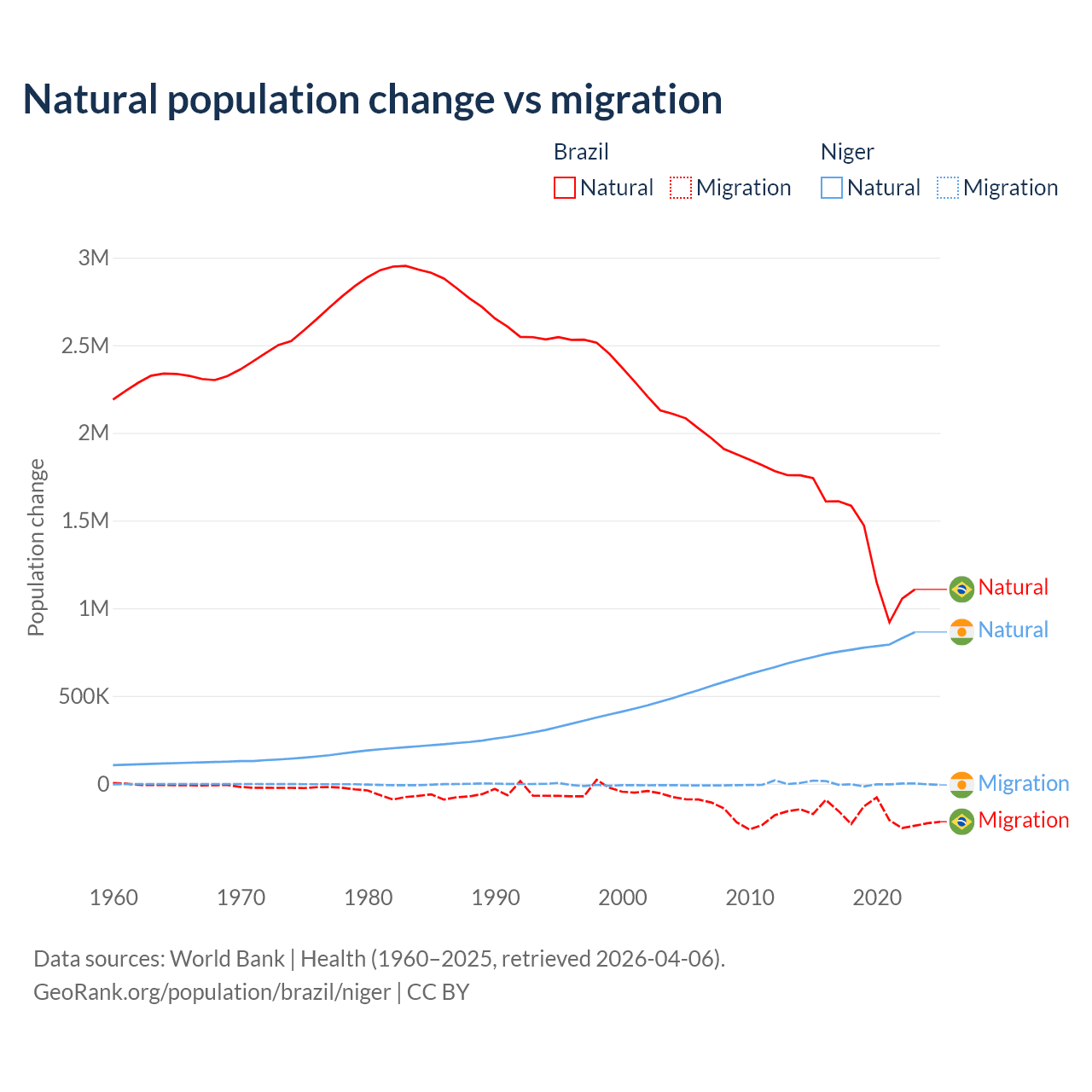 Over the last 10 years, 89.1% of the population change in Brazil is from natural causes (a gain of 14,004,164 people) and 10.9% is from migration (a loss of 1,708,894 people). In Niger 100% is from natural causes (a gain of 7,728,287 people) and 0.03% is from migration (a gain of 2,520 people).
