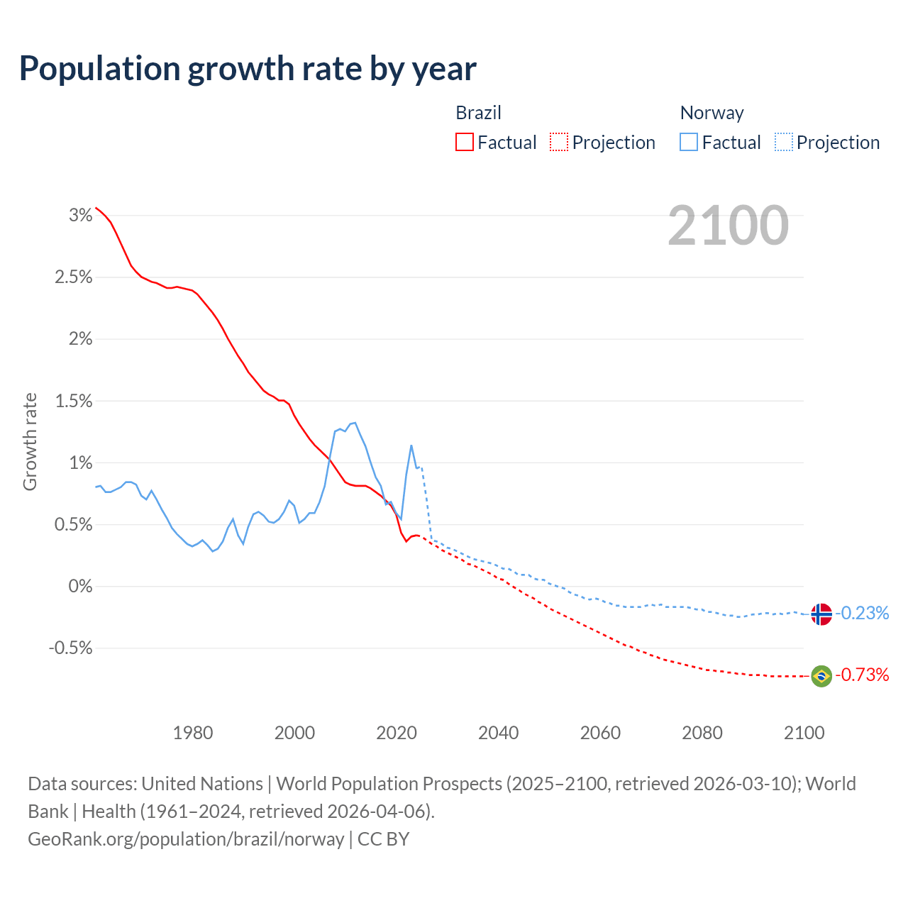 - For the last 10 years, Brazil has had an average growth rate of +0.6% per year vs +0.85% in Norway.
