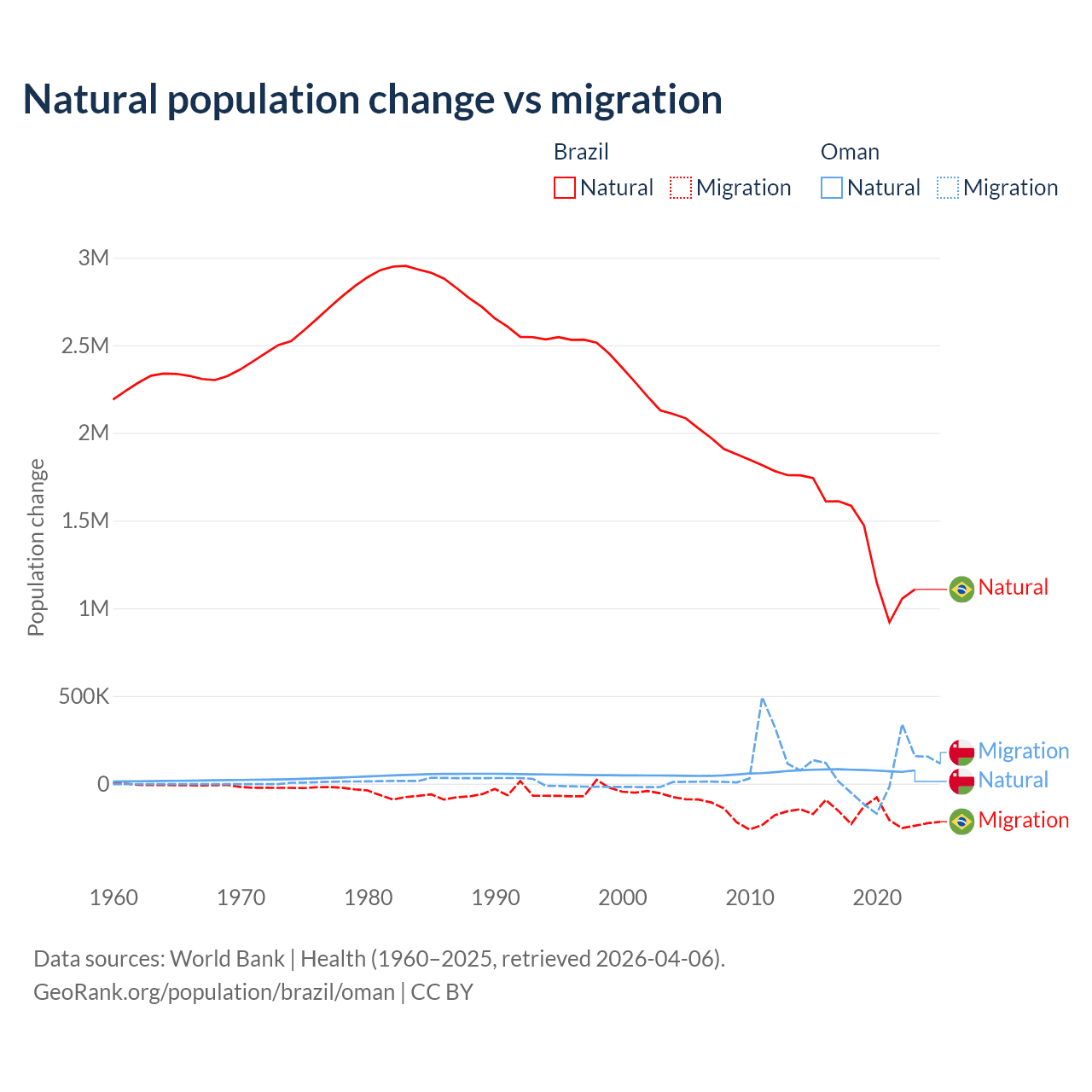 Over the last 10 years, 89.1% of the population change in Brazil is from natural causes (a gain of 14,004,164 people) and 10.9% is from migration (a loss of 1,708,894 people). In Oman 61.6% is from natural causes (a gain of 763,049 people) and 38.4% is from migration (a gain of 475,565 people).