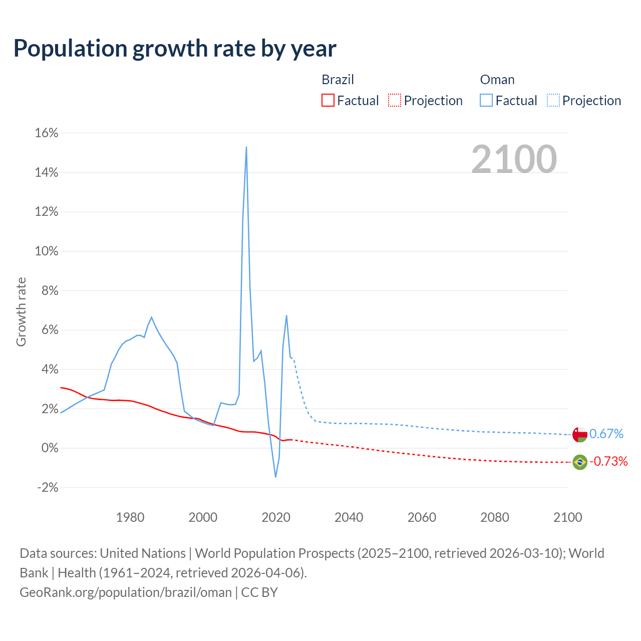 - For the last 10 years, Brazil has had an average growth rate of +0.6% per year vs +2.99% in Oman.