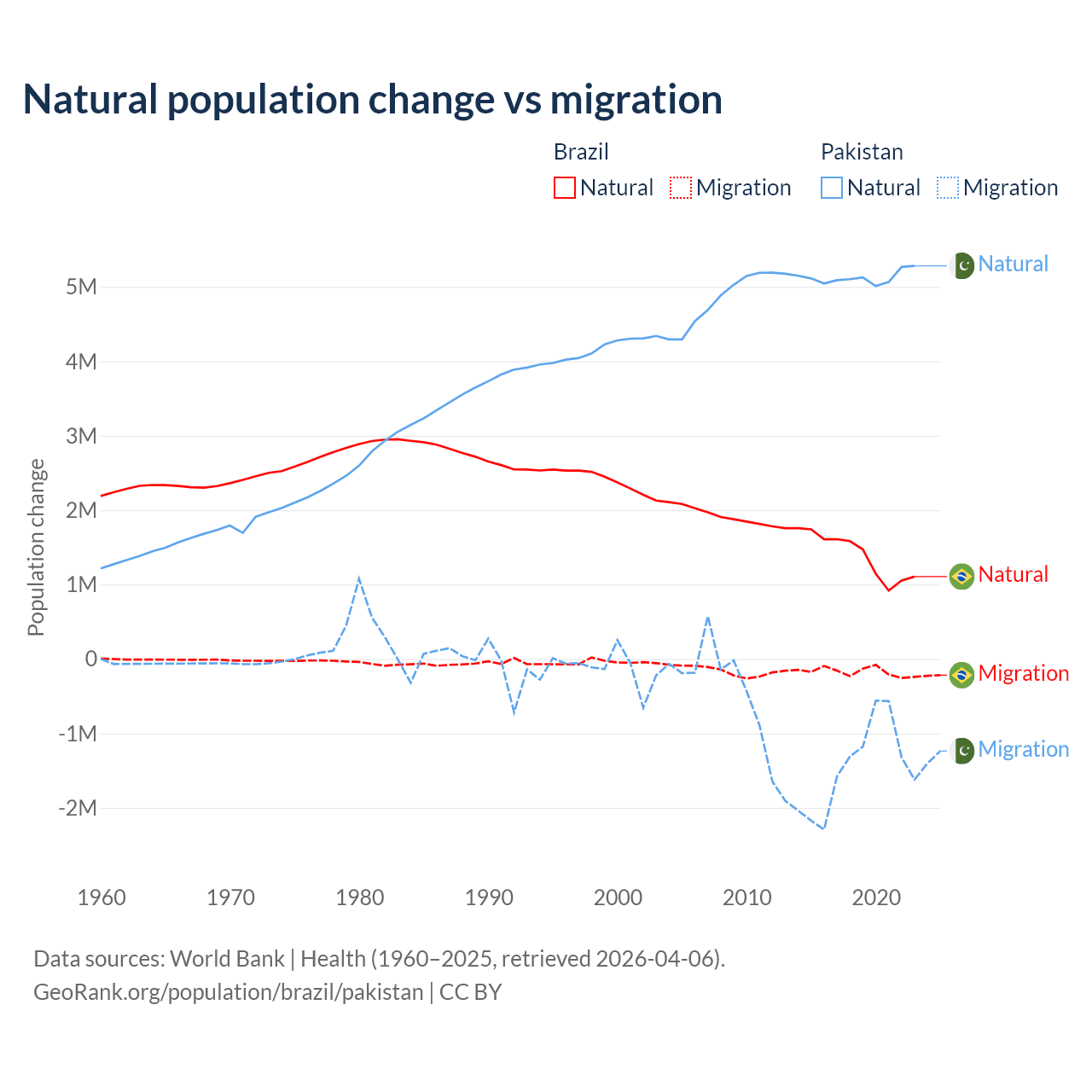 Over the last 10 years, 89.1% of the population change in Brazil is from natural causes (a gain of 14,004,164 people) and 10.9% is from migration (a loss of 1,708,894 people). In Pakistan 77.8% is from natural causes (a gain of 51,255,404 people) and 22.2% is from migration (a loss of 14,629,055 people).