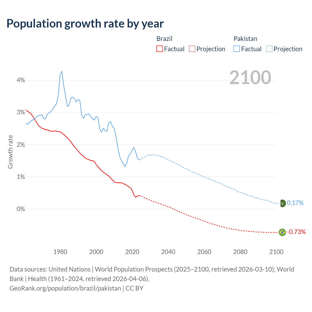 - For the last 10 years, Brazil has had an average growth rate of +0.6% per year vs +1.6% in Pakistan.