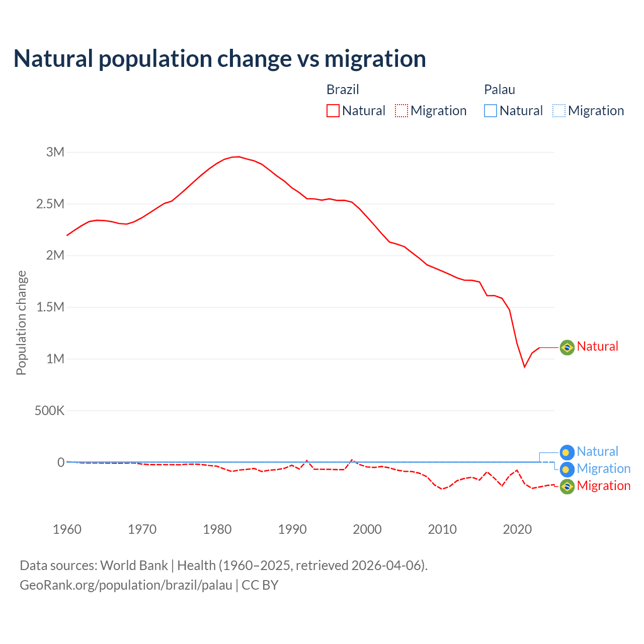 Over the last 10 years, 89.1% of the population change in Brazil is from natural causes (a gain of 14,004,164 people) and 10.9% is from migration (a loss of 1,708,894 people). In Palau 53.8% is from natural causes (a gain of 264 people) and 46.2% is from migration (a loss of 227 people).