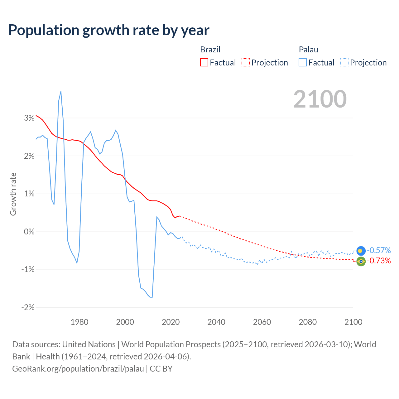- For the last 10 years, Brazil has had an average growth rate of +0.6% per year vs +0.02% in Palau.