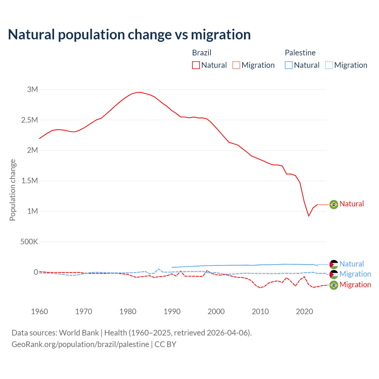 Over the last 10 years, 89.1% of the population change in Brazil is from natural causes (a gain of 14,004,164 people) and 10.9% is from migration (a loss of 1,708,894 people). In Palestine 85.7% is from natural causes (a gain of 1,218,010 people) and 14.3% is from migration (a loss of 202,820 people).