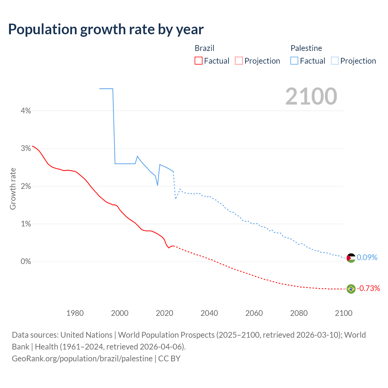 - For the last 10 years, Brazil has had an average growth rate of +0.6% per year vs +2.4% in Palestine.