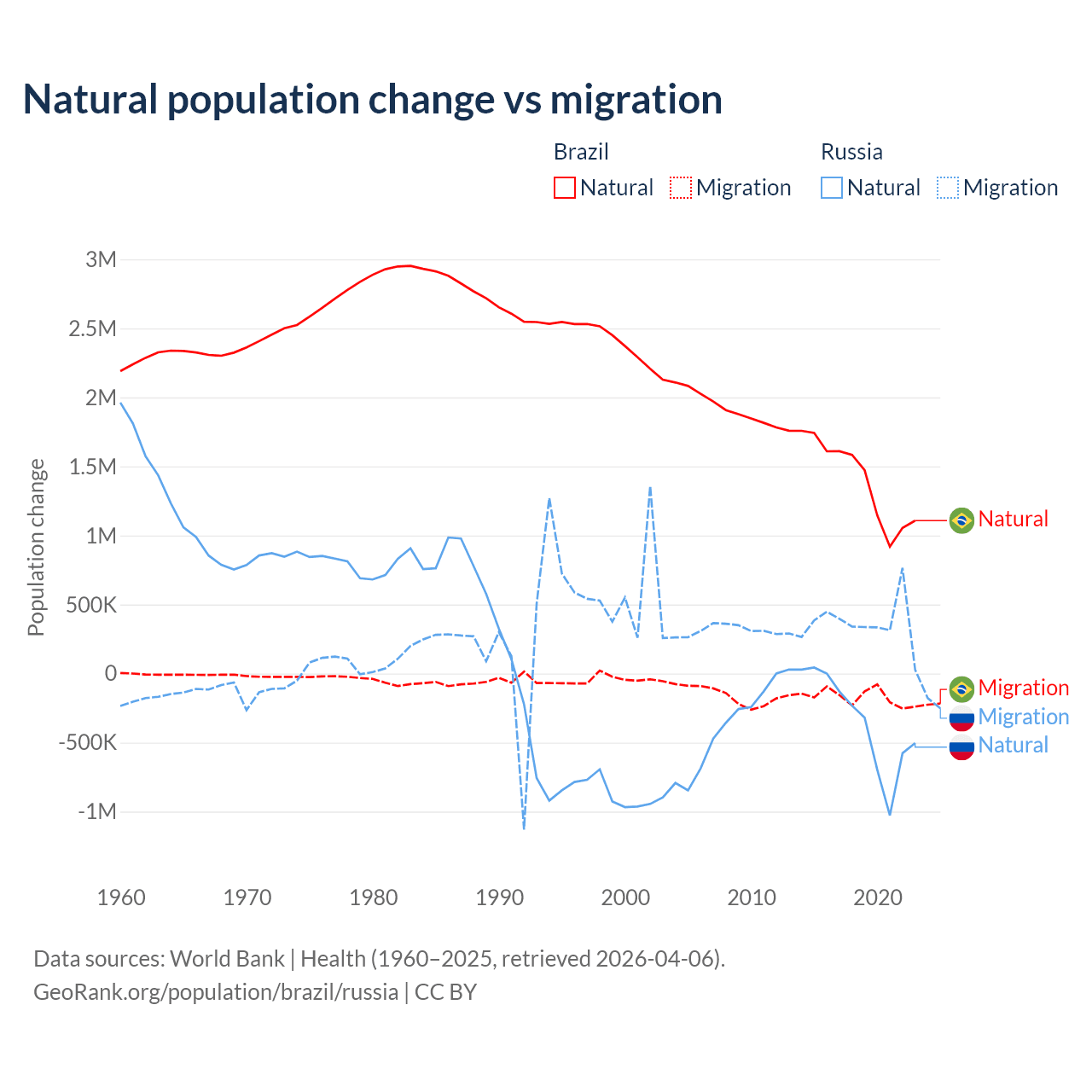 Over the last 10 years, 89.1% of the population change in Brazil is from natural causes (a gain of 14,004,164 people) and 10.9% is from migration (a loss of 1,708,894 people). In Russia 48.6% is from natural causes (a loss of 3,416,377 people) and 51.4% is from migration (a gain of 3,611,826 people).