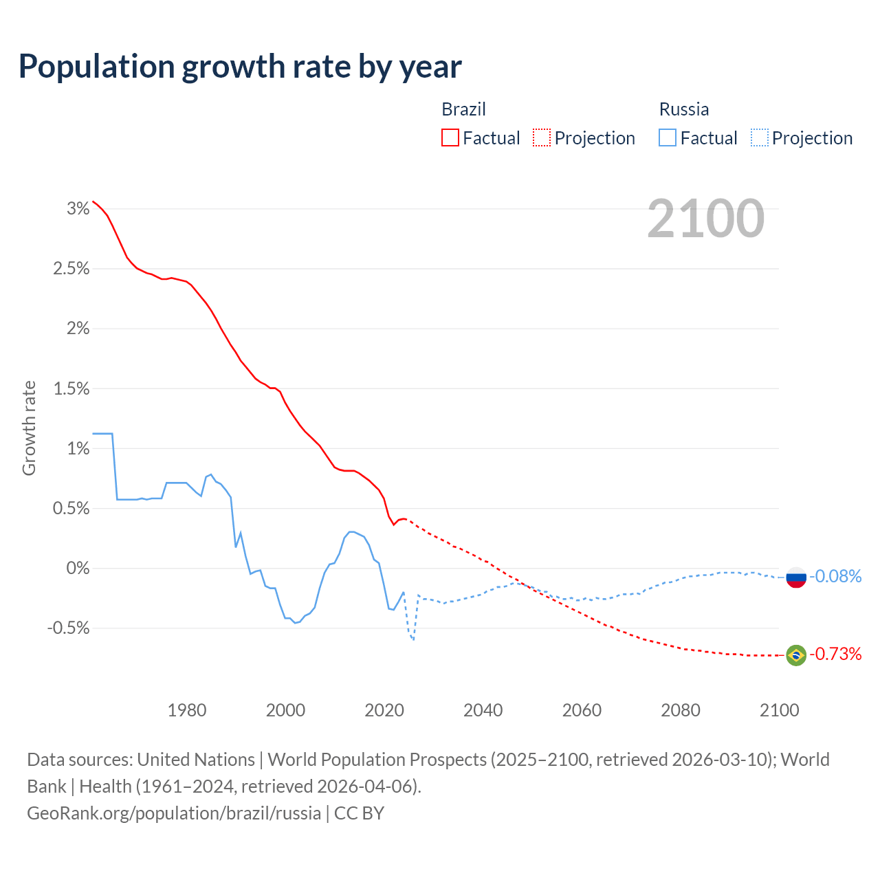 - For the last 10 years, Brazil has had an average growth rate of +0.6% per year vs -0.02% in Russia.