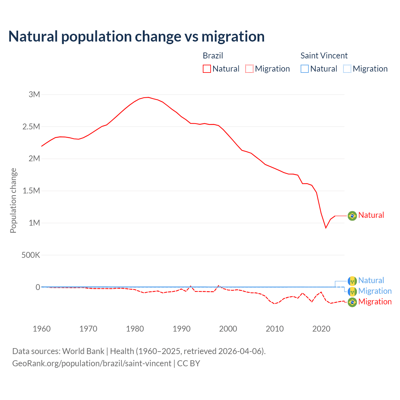 Over the last 10 years, 89.1% of the population change in Brazil is from natural causes (a gain of 14,004,164 people) and 10.9% is from migration (a loss of 1,708,894 people). In Saint Vincent 21.2% is from natural causes (a gain of 2,525 people) and 78.8% is from migration (a loss of 9,393 people).