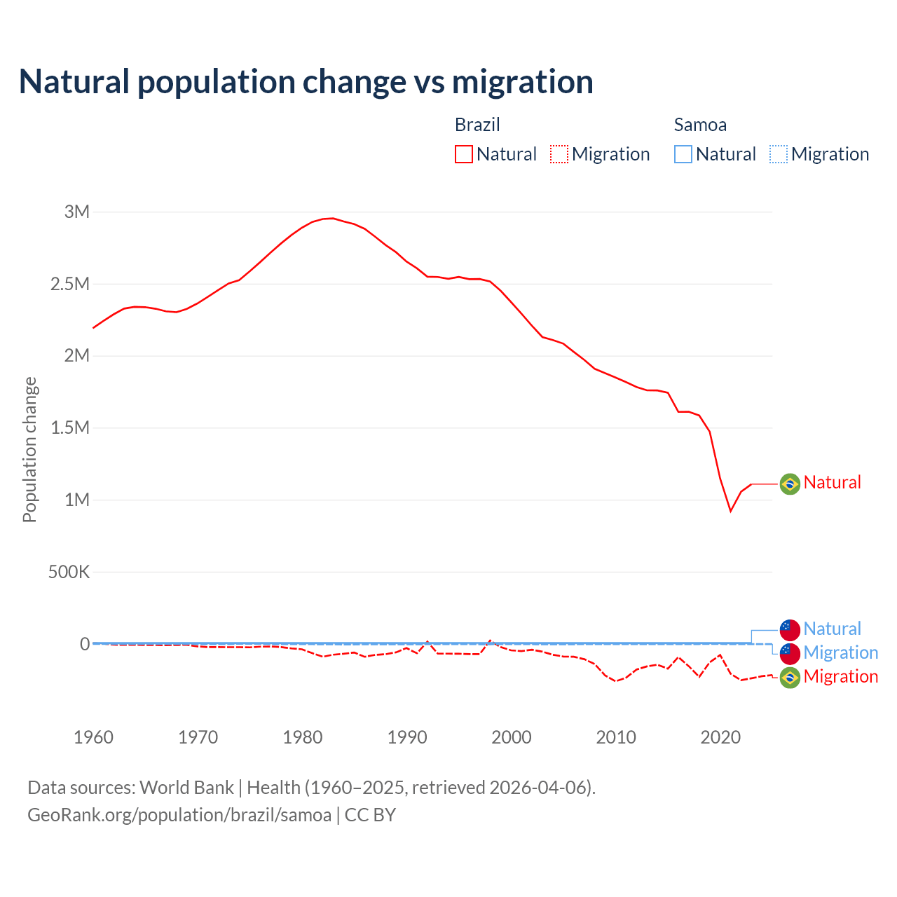 Over the last 10 years, 89.1% of the population change in Brazil is from natural causes (a gain of 14,004,164 people) and 10.9% is from migration (a loss of 1,708,894 people). In Samoa 62.5% is from natural causes (a gain of 45,436 people) and 37.5% is from migration (a loss of 27,246 people).