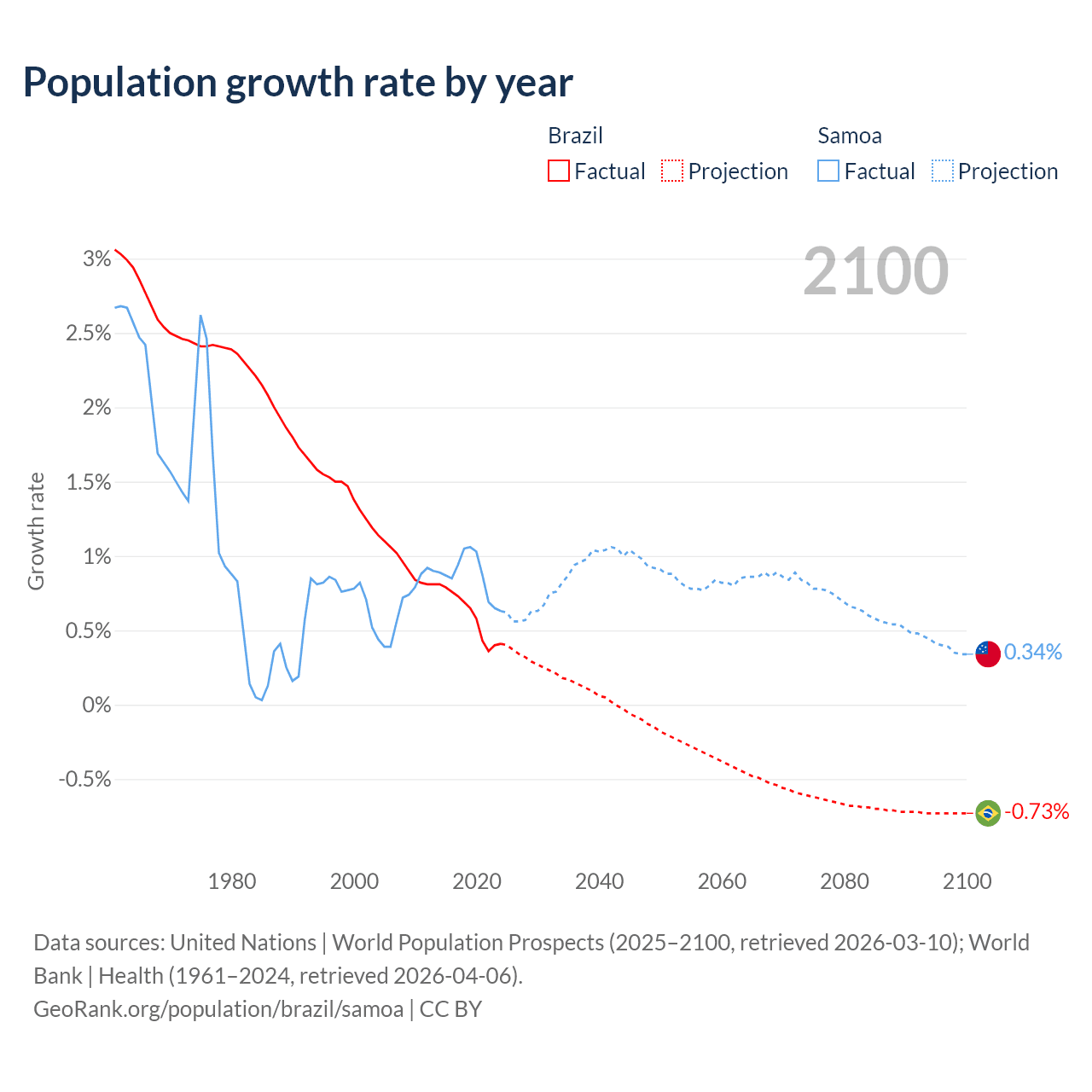 - For the last 10 years, Brazil has had an average growth rate of +0.6% per year vs +0.87% in Samoa.