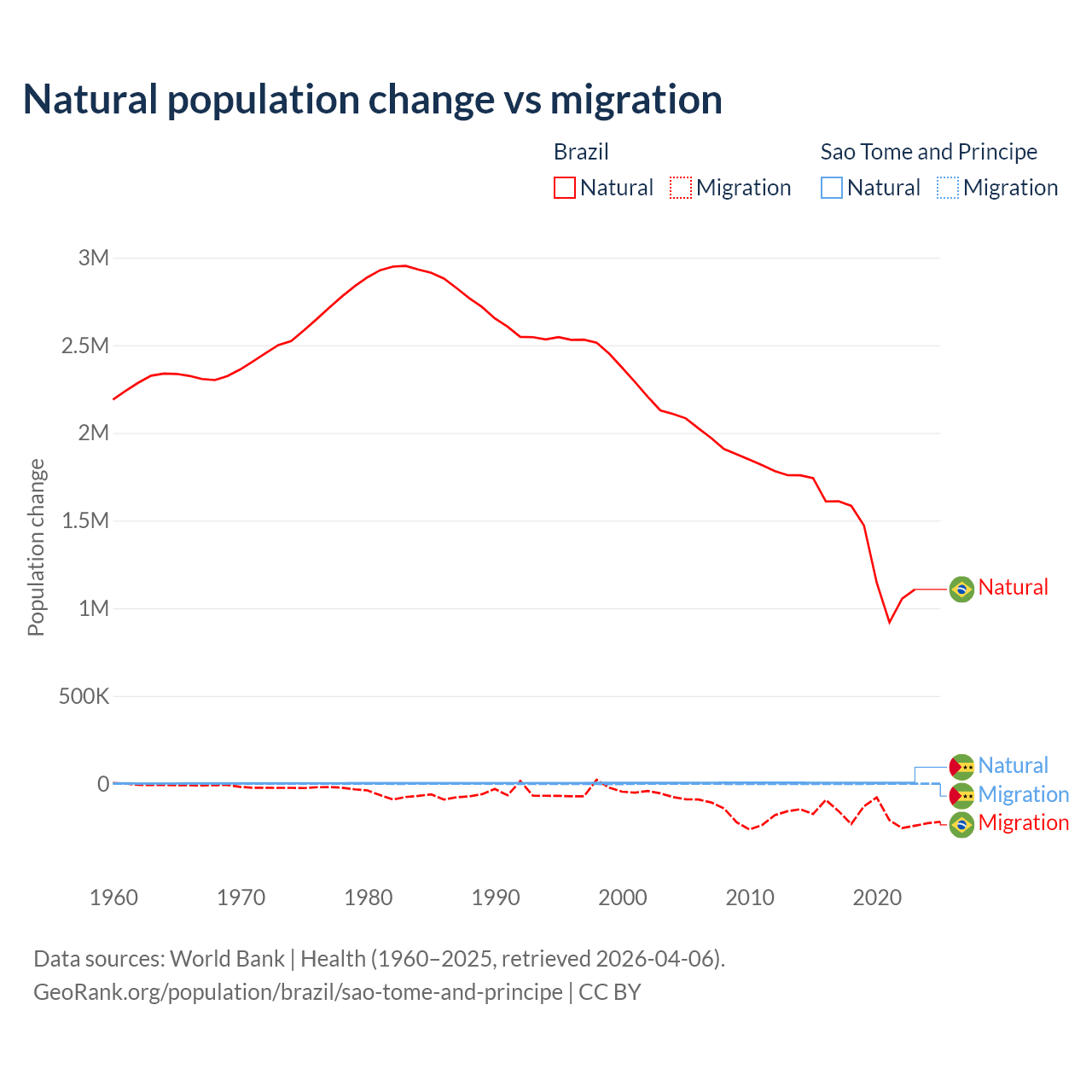 Over the last 10 years, 89.1% of the population change in Brazil is from natural causes (a gain of 14,004,164 people) and 10.9% is from migration (a loss of 1,708,894 people). In Sao Tome and Principe 80.1% is from natural causes (a gain of 50,822 people) and 19.9% is from migration (a loss of 12,621 people).