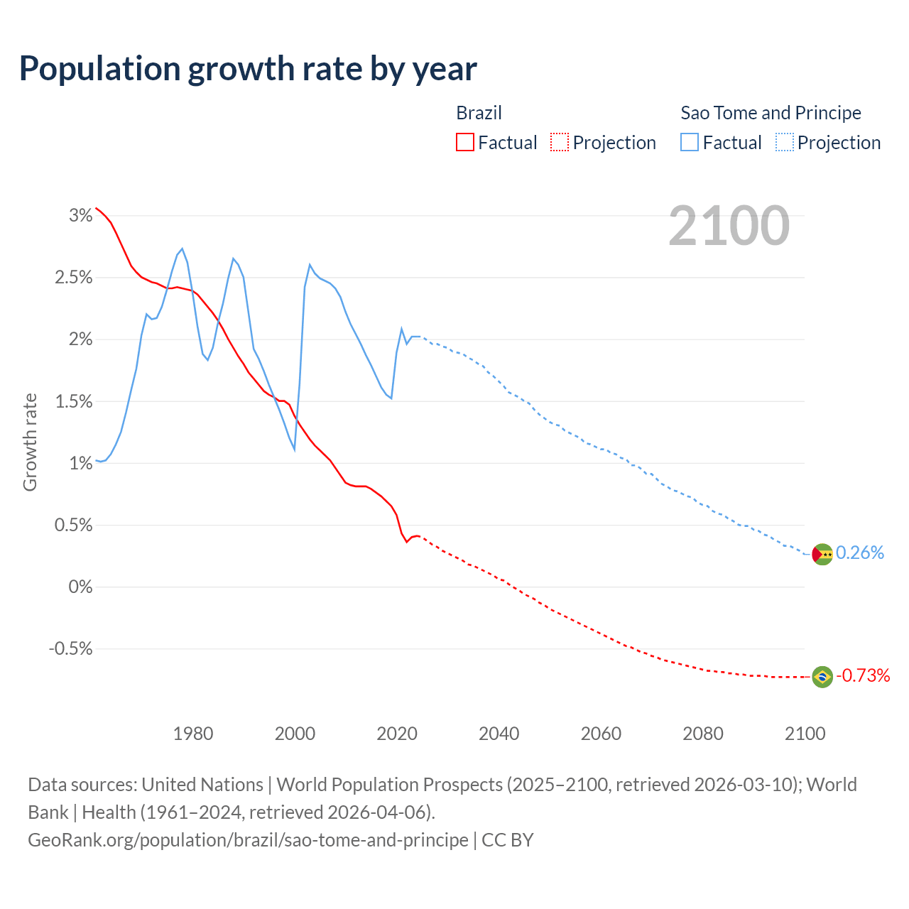 - For the last 10 years, Brazil has had an average growth rate of +0.6% per year vs +1.82% in Sao Tome and Principe.