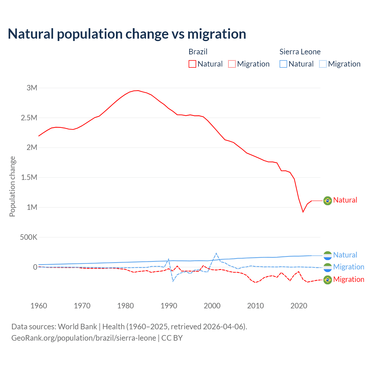 Over the last 10 years, 89.1% of the population change in Brazil is from natural causes (a gain of 14,004,164 people) and 10.9% is from migration (a loss of 1,708,894 people). In Sierra Leone 99.6% is from natural causes (a gain of 1,764,049 people) and 0.41% is from migration (a loss of 7,211 people).