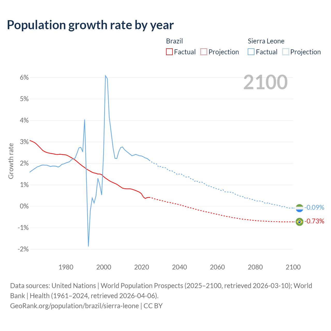 - For the last 10 years, Brazil has had an average growth rate of +0.6% per year vs +2.32% in Sierra Leone.