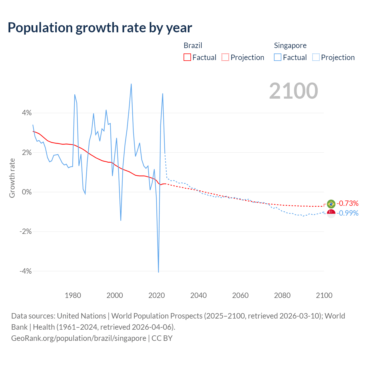 - For the last 10 years, Brazil has had an average growth rate of +0.6% per year vs +1.04% in Singapore.