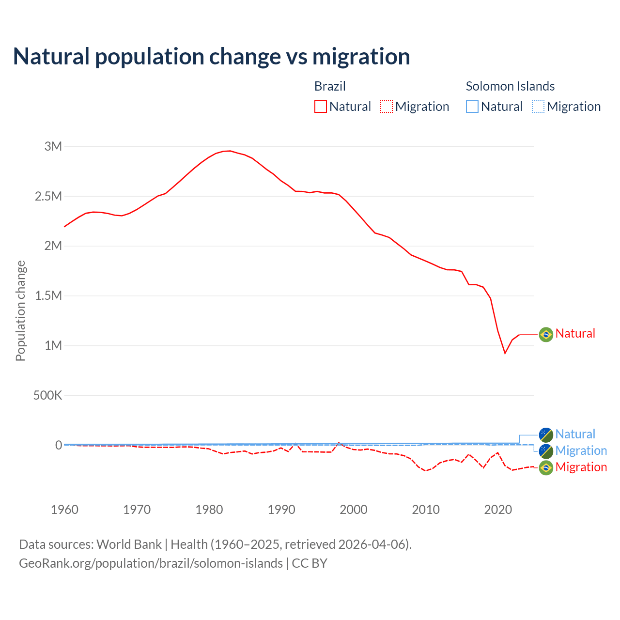 Over the last 10 years, 89.1% of the population change in Brazil is from natural causes (a gain of 14,004,164 people) and 10.9% is from migration (a loss of 1,708,894 people). In the Solomon Islands 82.8% is from natural causes (a gain of 168,727 people) and 17.2% is from migration (a gain of 35,031 people).