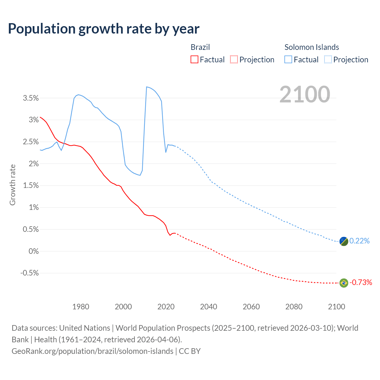 - For the last 10 years, Brazil has had an average growth rate of +0.6% per year vs +2.95% in the Solomon Islands.