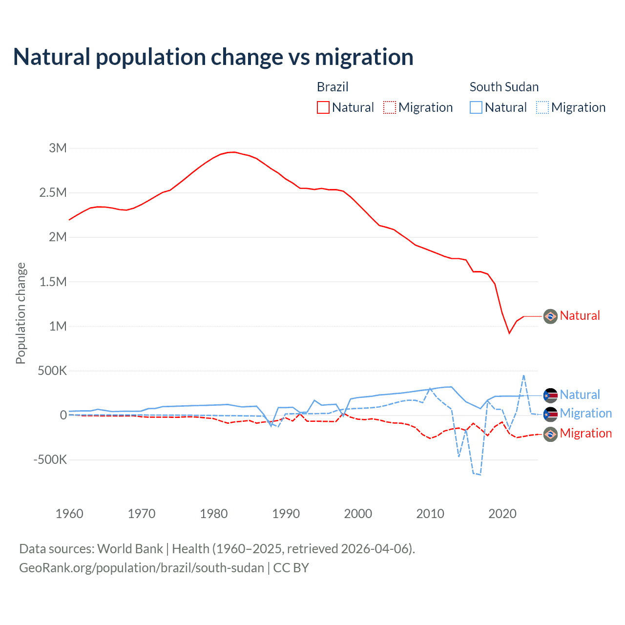 Over the last 10 years, 89.1% of the population change in Brazil is from natural causes (a gain of 14,004,164 people) and 10.9% is from migration (a loss of 1,708,894 people). In South Sudan 57.4% is from natural causes (a gain of 1,792,135 people) and 42.6% is from migration (a loss of 1,329,606 people).