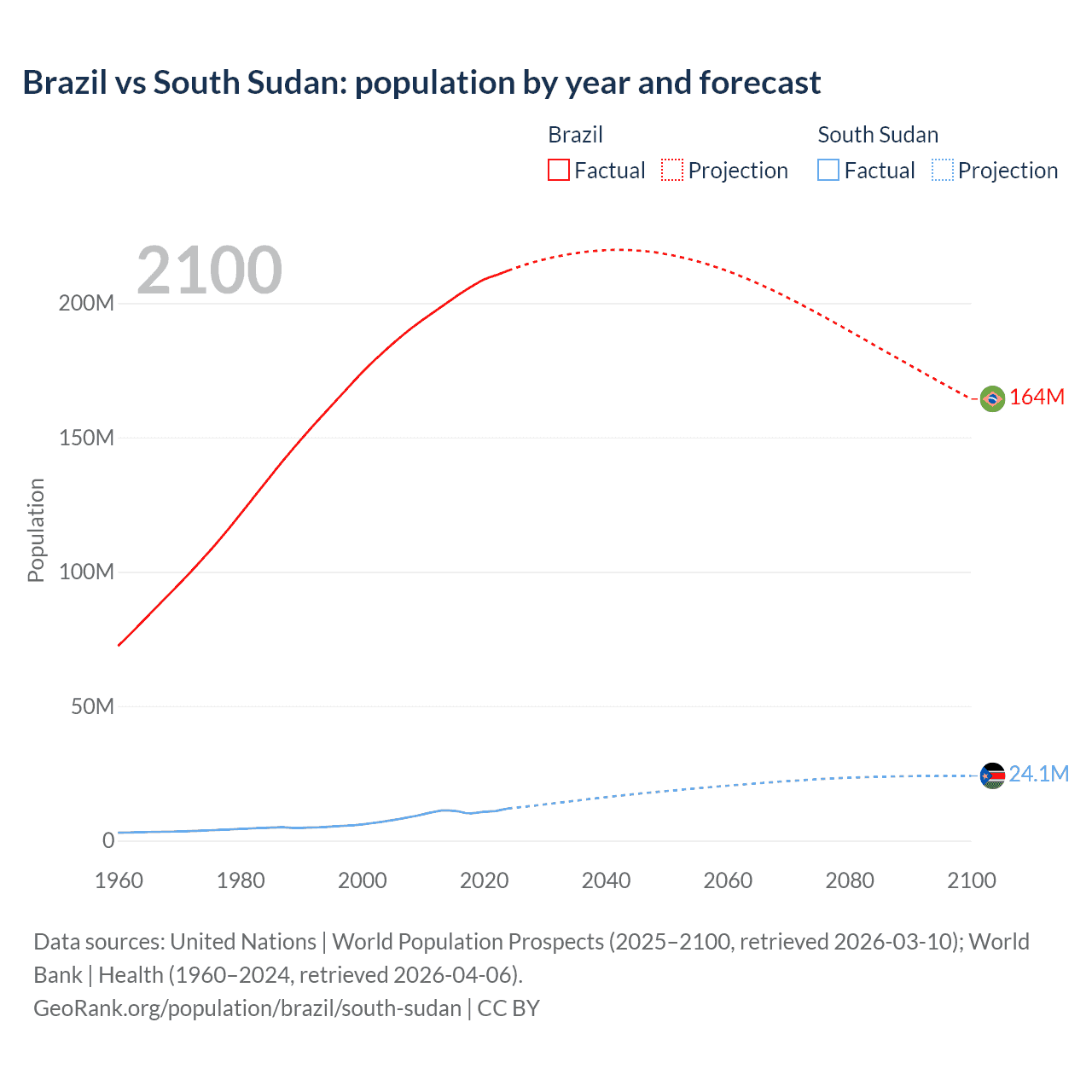 The latest officially reported population of Brazil was 211,998,573 in 2024 vs 11,943,408 people in South Sudan in 2024. In 2026, based on the adjusted UN estimation, the current Brazil's population is 213,824,938 people compared to 12,507,858 in South Sudan.