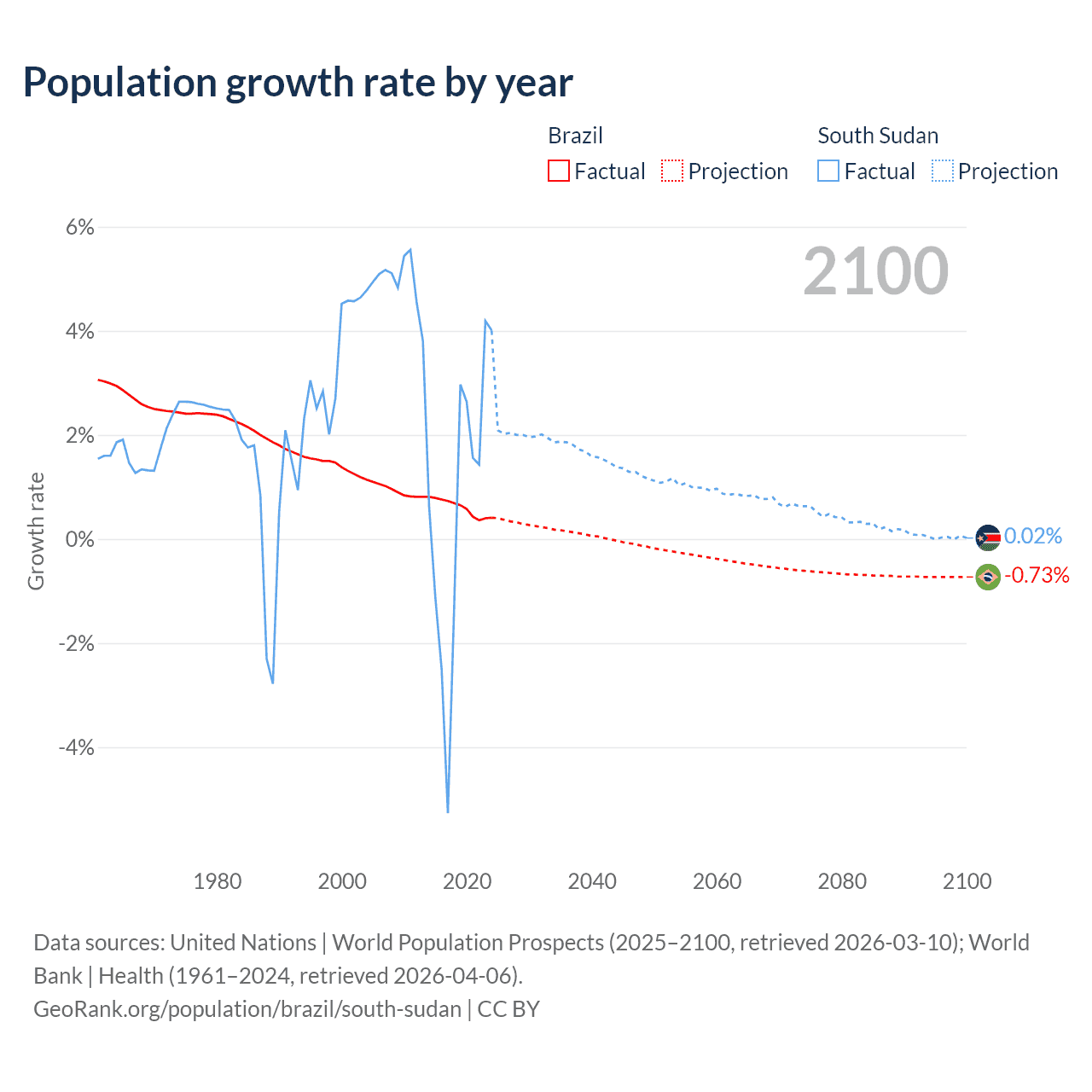 - For the last 10 years, Brazil has had an average growth rate of +0.6% per year vs +0.65% in South Sudan.