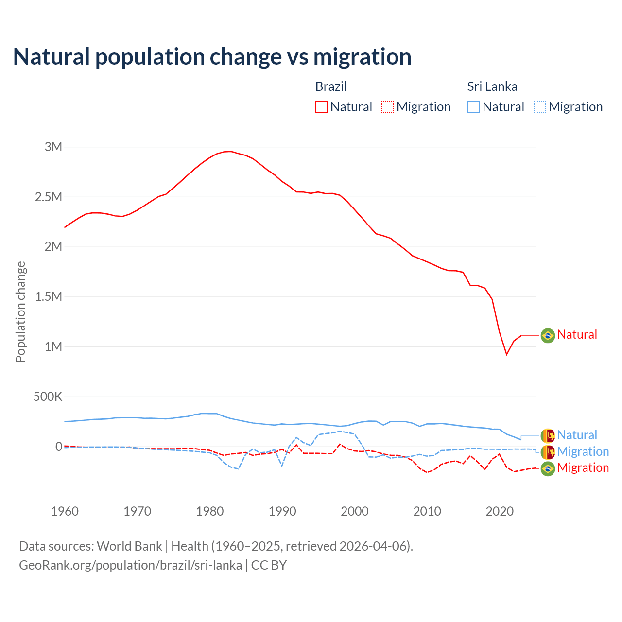 Over the last 10 years, 89.1% of the population change in Brazil is from natural causes (a gain of 14,004,164 people) and 10.9% is from migration (a loss of 1,708,894 people). In Sri Lanka 85.3% is from natural causes (a gain of 1,605,749 people) and 14.7% is from migration (a loss of 276,121 people).
