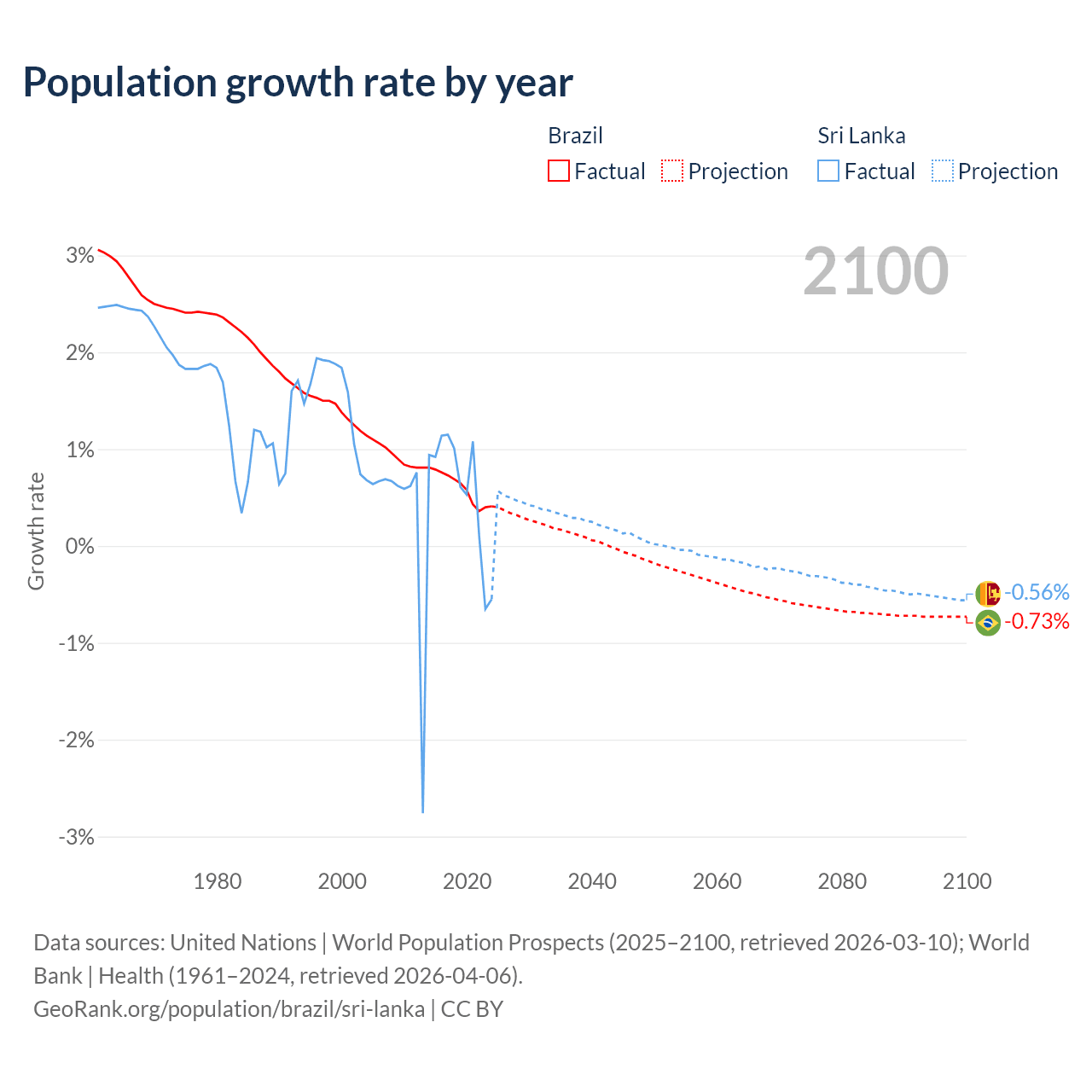 - For the last 10 years, Brazil has had an average growth rate of +0.6% per year vs +0.57% in Sri Lanka.