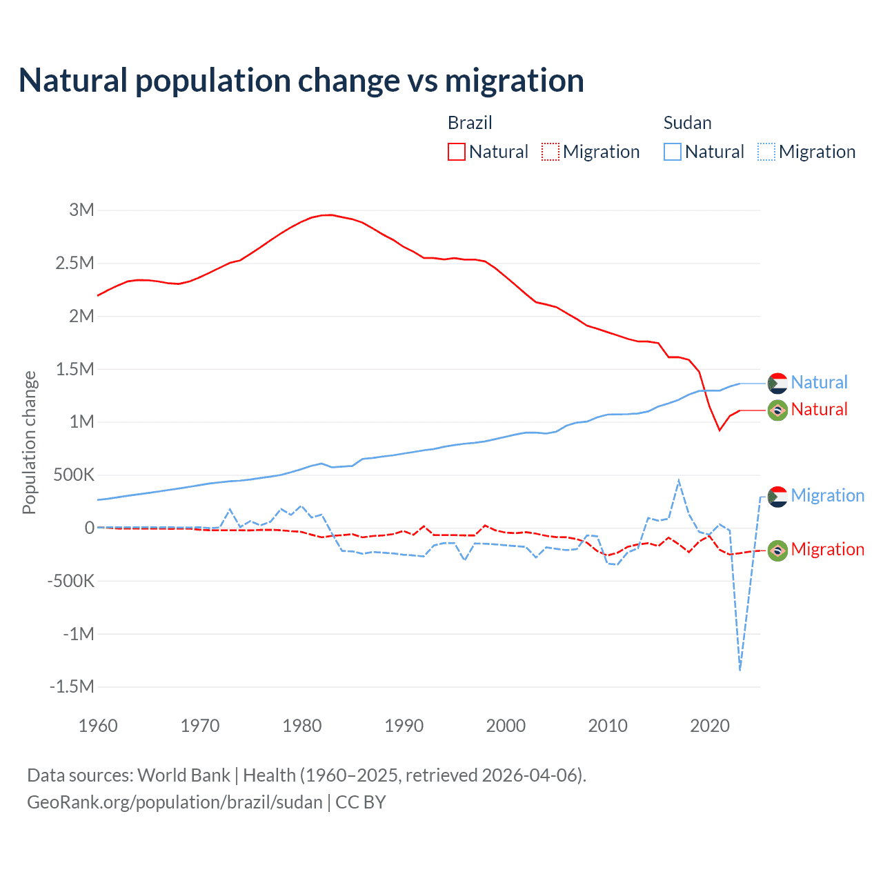 Over the last 10 years, 89.1% of the population change in Brazil is from natural causes (a gain of 14,004,164 people) and 10.9% is from migration (a loss of 1,708,894 people). In Sudan 95.1% is from natural causes (a gain of 12,459,977 people) and 4.88% is from migration (a loss of 639,596 people).