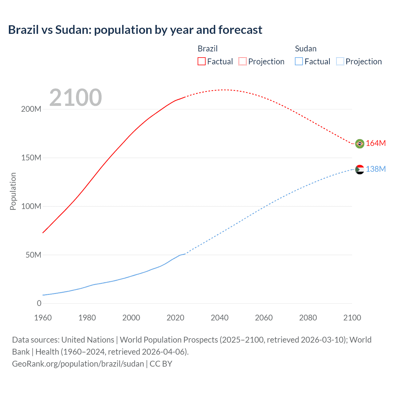 The latest officially reported population of Brazil was 211,998,573 in 2024 vs 50,448,963 people in Sudan in 2024. In 2026, based on the adjusted UN estimation, the current Brazil's population is 213,824,938 people compared to 53,335,233 in Sudan.