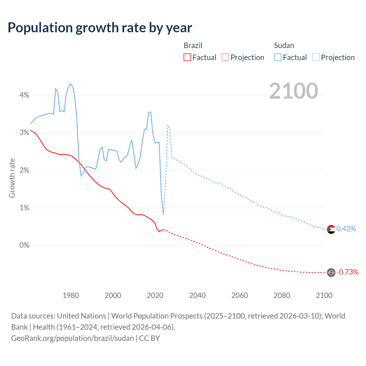 - For the last 10 years, Brazil has had an average growth rate of +0.6% per year vs +2.67% in Sudan.