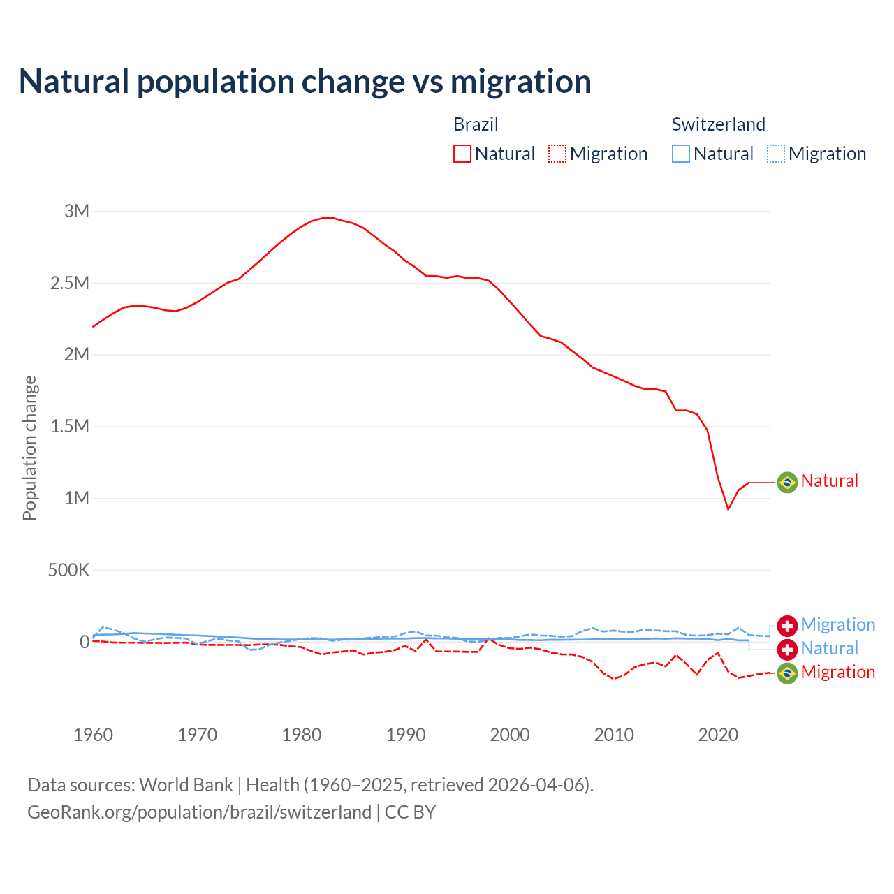 Over the last 10 years, 89.1% of the population change in Brazil is from natural causes (a gain of 14,004,164 people) and 10.9% is from migration (a loss of 1,708,894 people). In Switzerland 21.6% is from natural causes (a gain of 165,354 people) and 78.4% is from migration (a gain of 600,145 people).