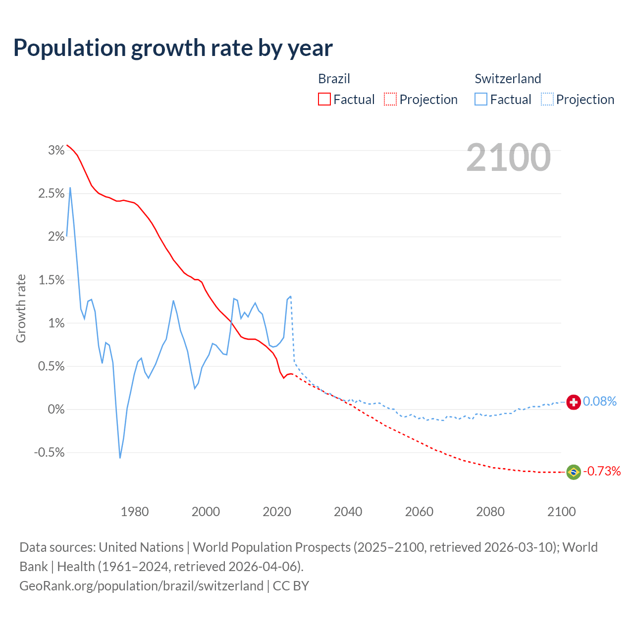 - For the last 10 years, Brazil has had an average growth rate of +0.6% per year vs +0.98% in Switzerland.
