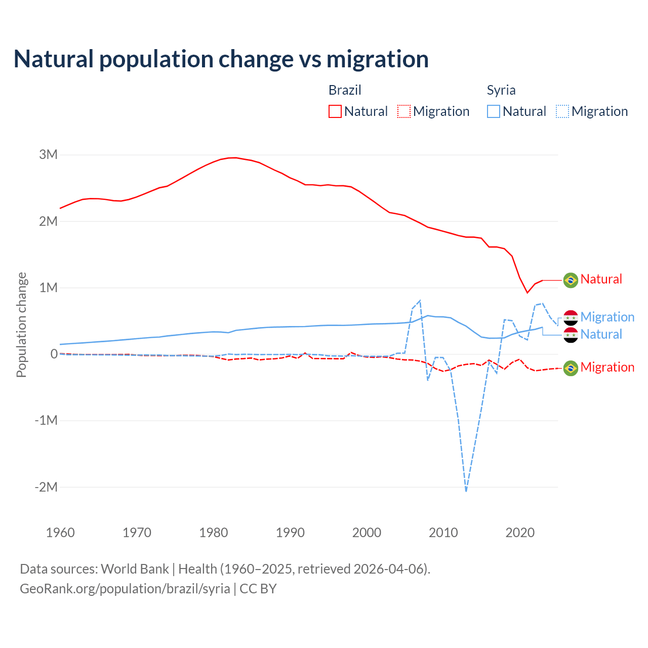Over the last 10 years, 89.1% of the population change in Brazil is from natural causes (a gain of 14,004,164 people) and 10.9% is from migration (a loss of 1,708,894 people). In Syria 91.3% is from natural causes (a gain of 3,047,621 people) and 8.72% is from migration (a gain of 291,069 people).