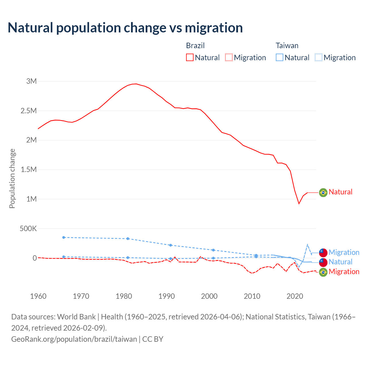 Over the last 10 years, 89.1% of the population change in Brazil is from natural causes (a gain of 14,004,164 people) and 10.9% is from migration (a loss of 1,708,894 people). In Taiwan 56.7% is from natural causes (a loss of 57,467 people) and 43.3% is from migration (a gain of 43,884 people).