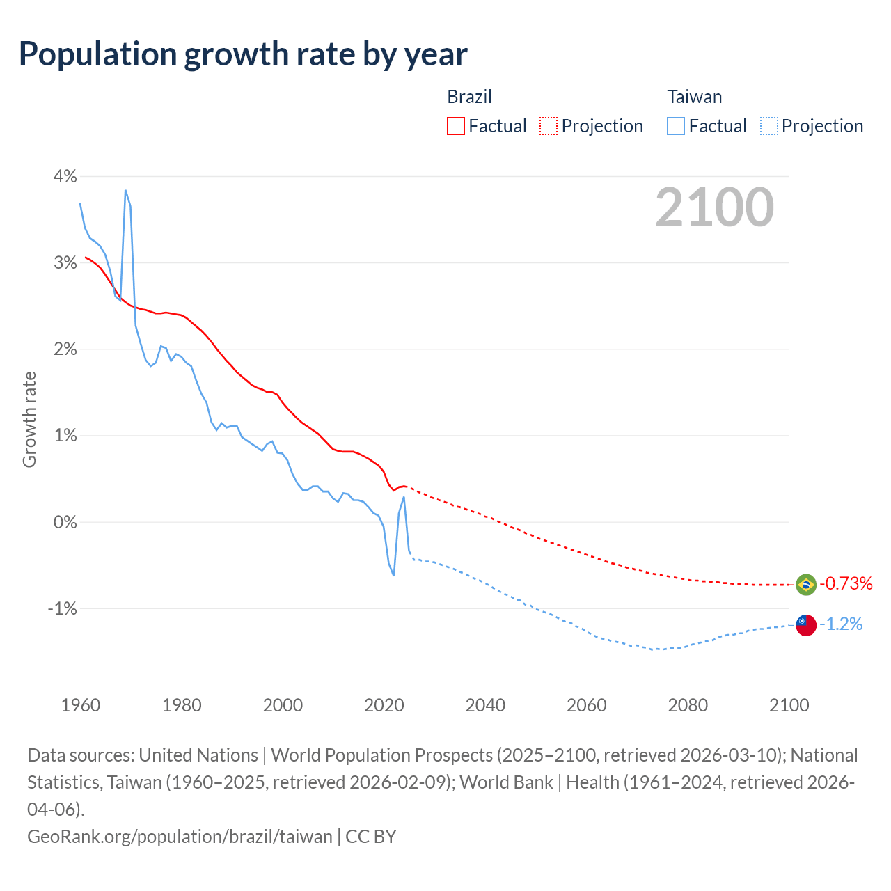 - For the last 10 years, Brazil has had an average growth rate of +0.6% per year vs -0.03% in Taiwan.