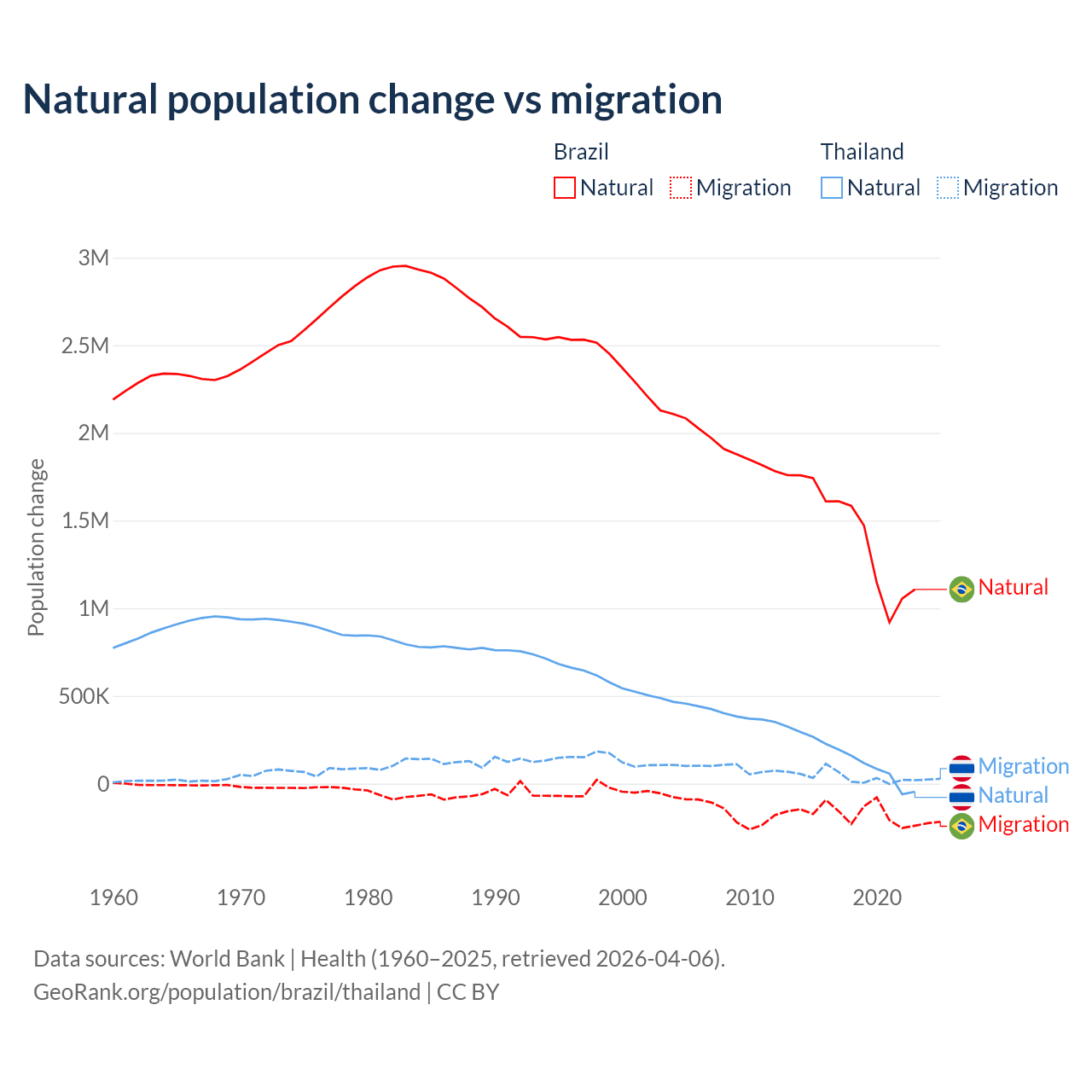 Over the last 10 years, 89.1% of the population change in Brazil is from natural causes (a gain of 14,004,164 people) and 10.9% is from migration (a loss of 1,708,894 people). In Thailand 78.4% is from natural causes (a gain of 1,292,528 people) and 21.6% is from migration (a gain of 355,361 people).