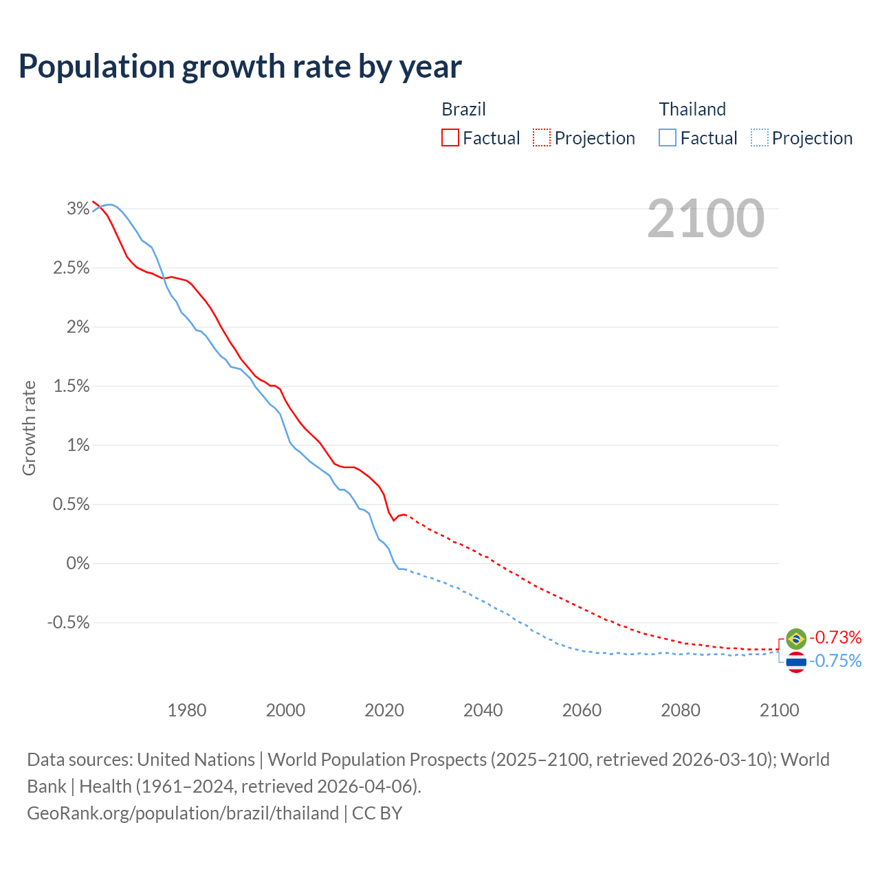 - For the last 10 years, Brazil has had an average growth rate of +0.6% per year vs +0.23% in Thailand.