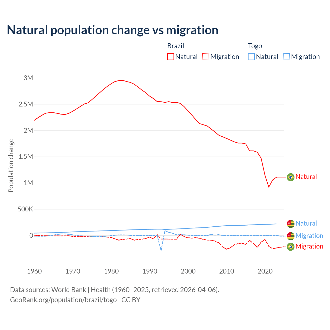 Over the last 10 years, 89.1% of the population change in Brazil is from natural causes (a gain of 14,004,164 people) and 10.9% is from migration (a loss of 1,708,894 people). In Togo 99.1% is from natural causes (a gain of 2,052,115 people) and 0.86% is from migration (a loss of 17,852 people).