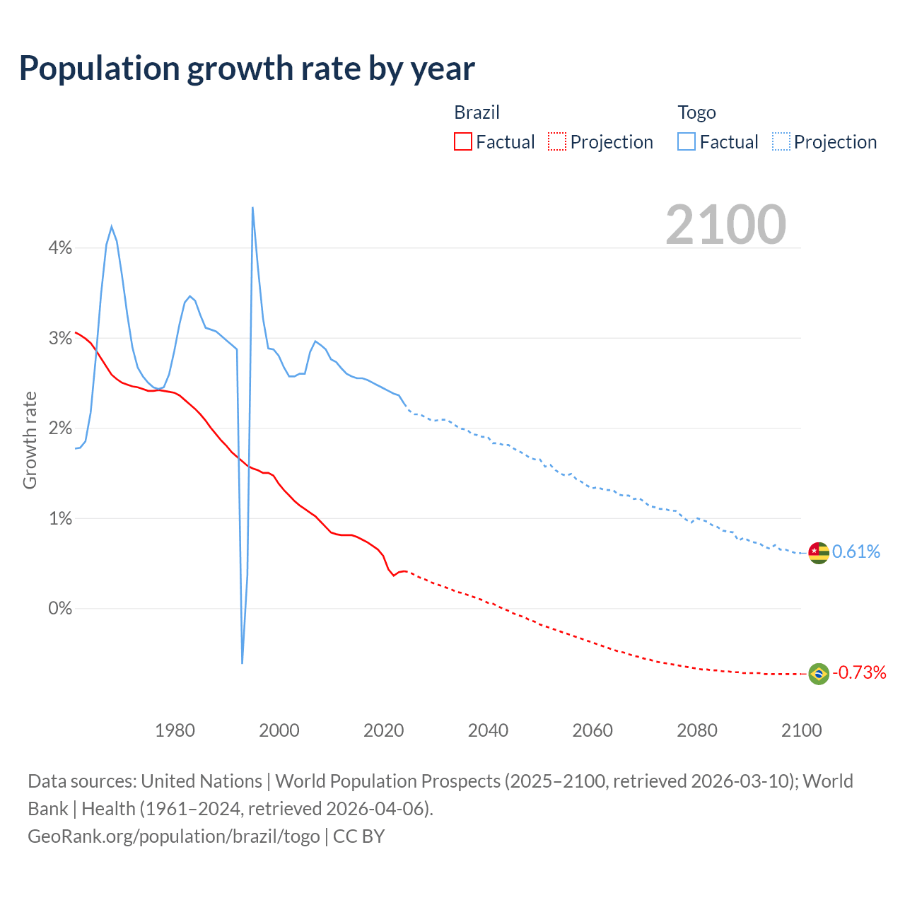 - For the last 10 years, Brazil has had an average growth rate of +0.6% per year vs +2.46% in Togo.