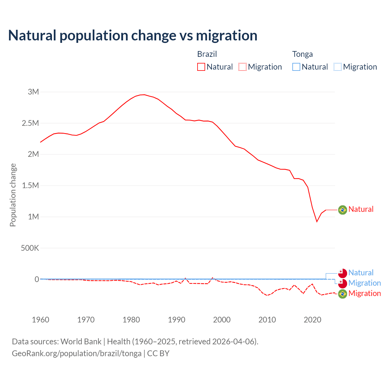 Over the last 10 years, 89.1% of the population change in Brazil is from natural causes (a gain of 14,004,164 people) and 10.9% is from migration (a loss of 1,708,894 people). In Tonga 46.9% is from natural causes (a gain of 18,919 people) and 53.1% is from migration (a loss of 21,384 people).