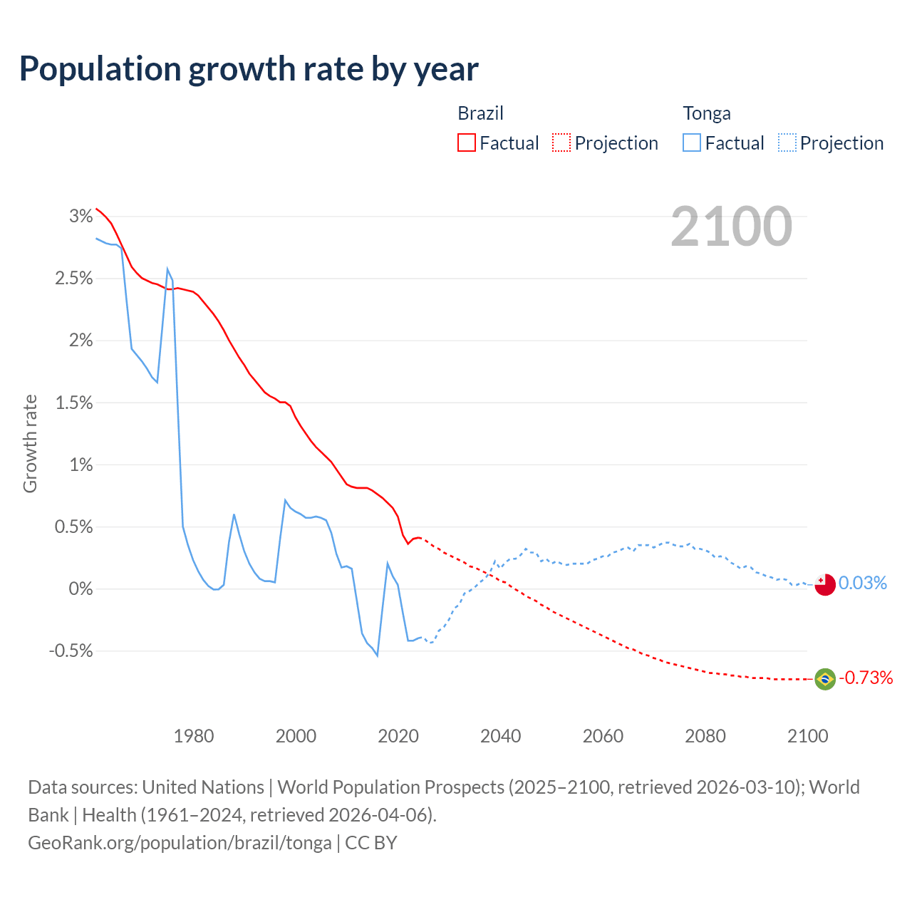 - For the last 10 years, Brazil has had an average growth rate of +0.6% per year vs -0.25% in Tonga.