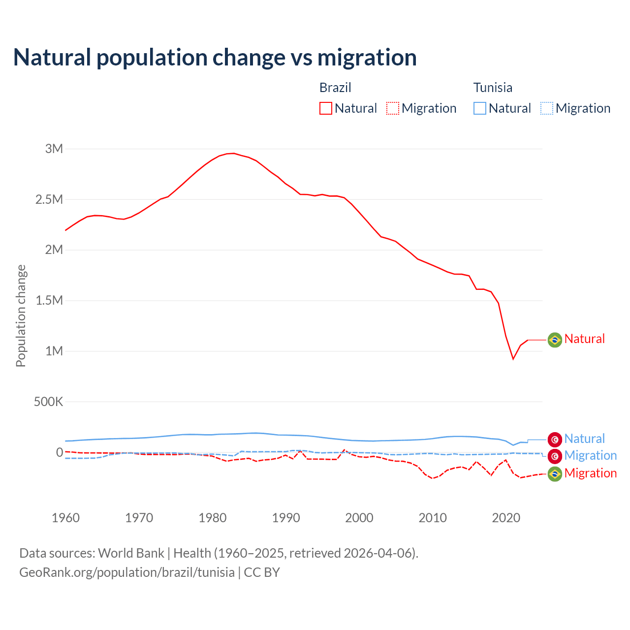 Over the last 10 years, 89.1% of the population change in Brazil is from natural causes (a gain of 14,004,164 people) and 10.9% is from migration (a loss of 1,708,894 people). In Tunisia 86.3% is from natural causes (a gain of 1,225,079 people) and 13.7% is from migration (a loss of 195,011 people).