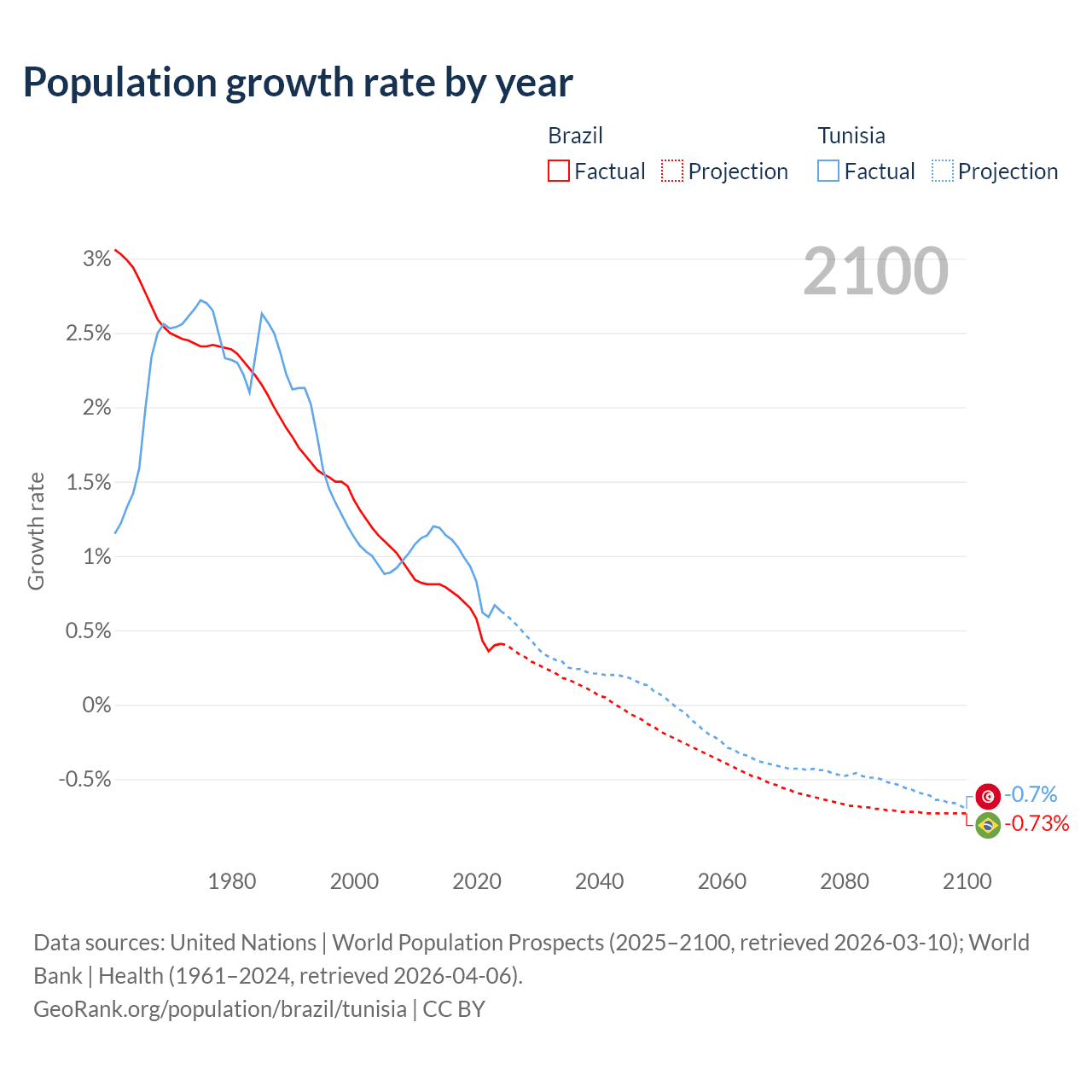 - For the last 10 years, Brazil has had an average growth rate of +0.6% per year vs +0.89% in Tunisia.
