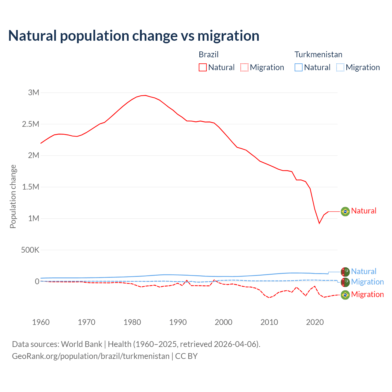 Over the last 10 years, 89.1% of the population change in Brazil is from natural causes (a gain of 14,004,164 people) and 10.9% is from migration (a loss of 1,708,894 people). In Turkmenistan 89.2% is from natural causes (a gain of 1,270,228 people) and 10.8% is from migration (a gain of 154,379 people).