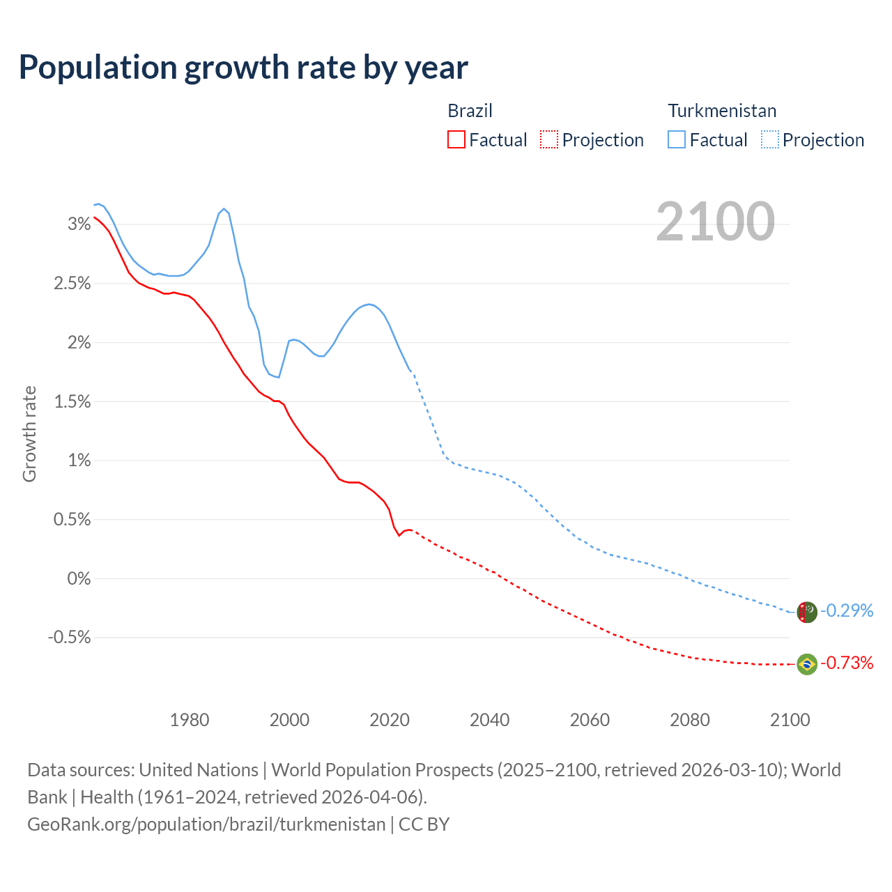 - For the last 10 years, Brazil has had an average growth rate of +0.6% per year vs +2.14% in Turkmenistan.