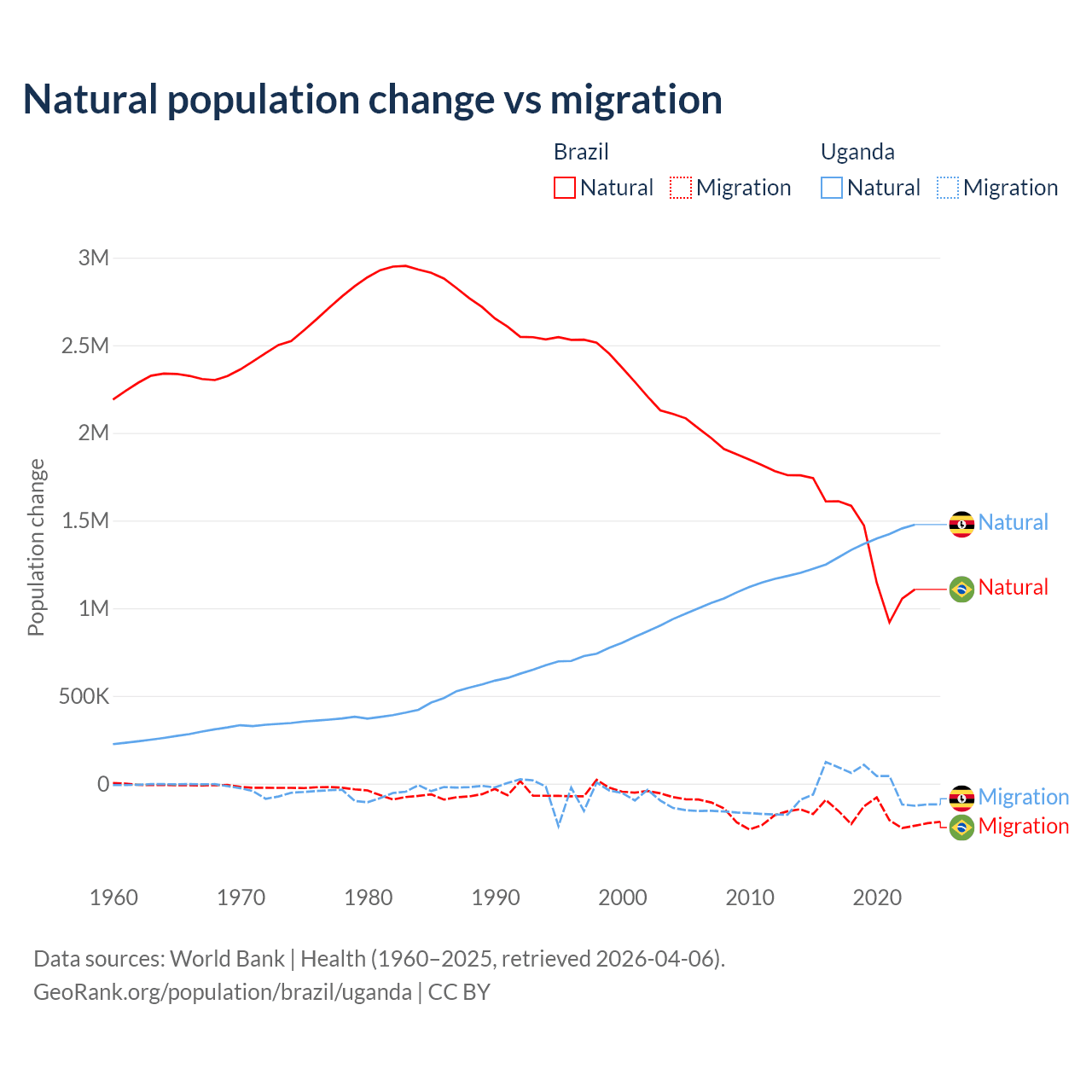 Over the last 10 years, 89.1% of the population change in Brazil is from natural causes (a gain of 14,004,164 people) and 10.9% is from migration (a loss of 1,708,894 people). In Uganda 99.5% is from natural causes (a gain of 13,419,712 people) and 0.53% is from migration (a gain of 71,457 people).