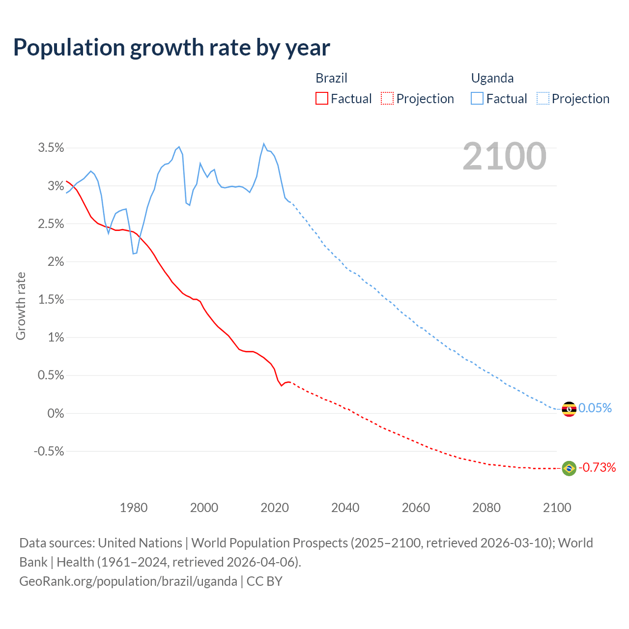 - For the last 10 years, Brazil has had an average growth rate of +0.6% per year vs +3.21% in Uganda.