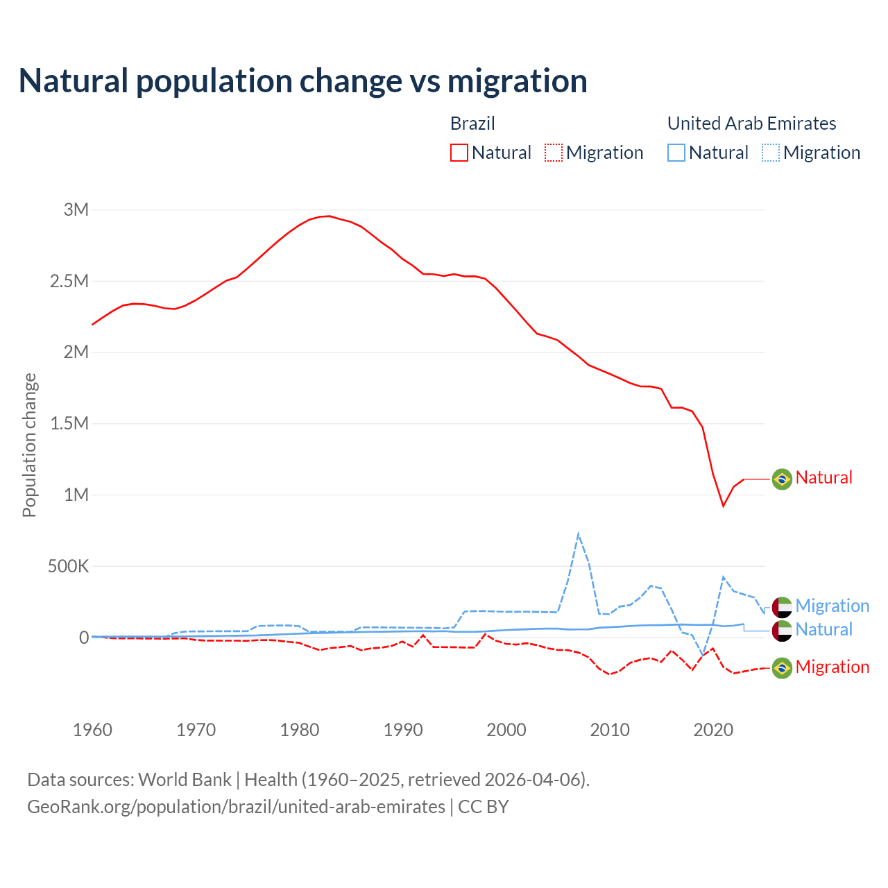 Over the last 10 years, 89.1% of the population change in Brazil is from natural causes (a gain of 14,004,164 people) and 10.9% is from migration (a loss of 1,708,894 people). In the United Arab Emirates 30.5% is from natural causes (a gain of 857,996 people) and 69.5% is from migration (a gain of 1,958,520 people).