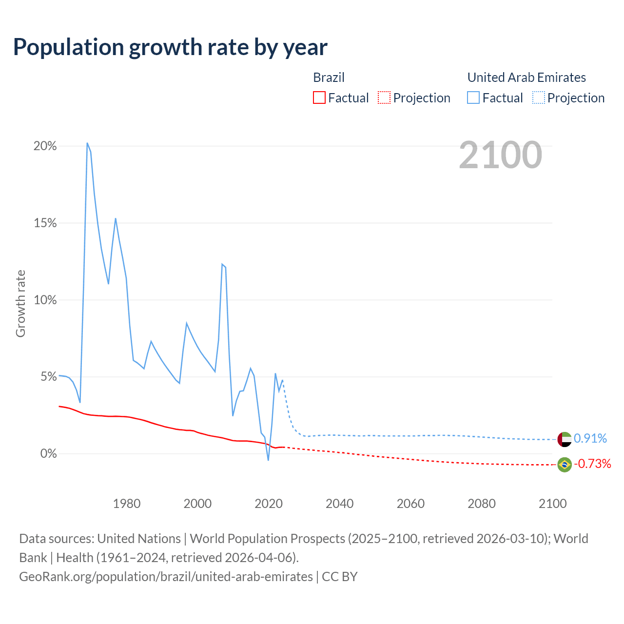 - For the last 10 years, Brazil has had an average growth rate of +0.6% per year vs +3.31% in the United Arab Emirates.