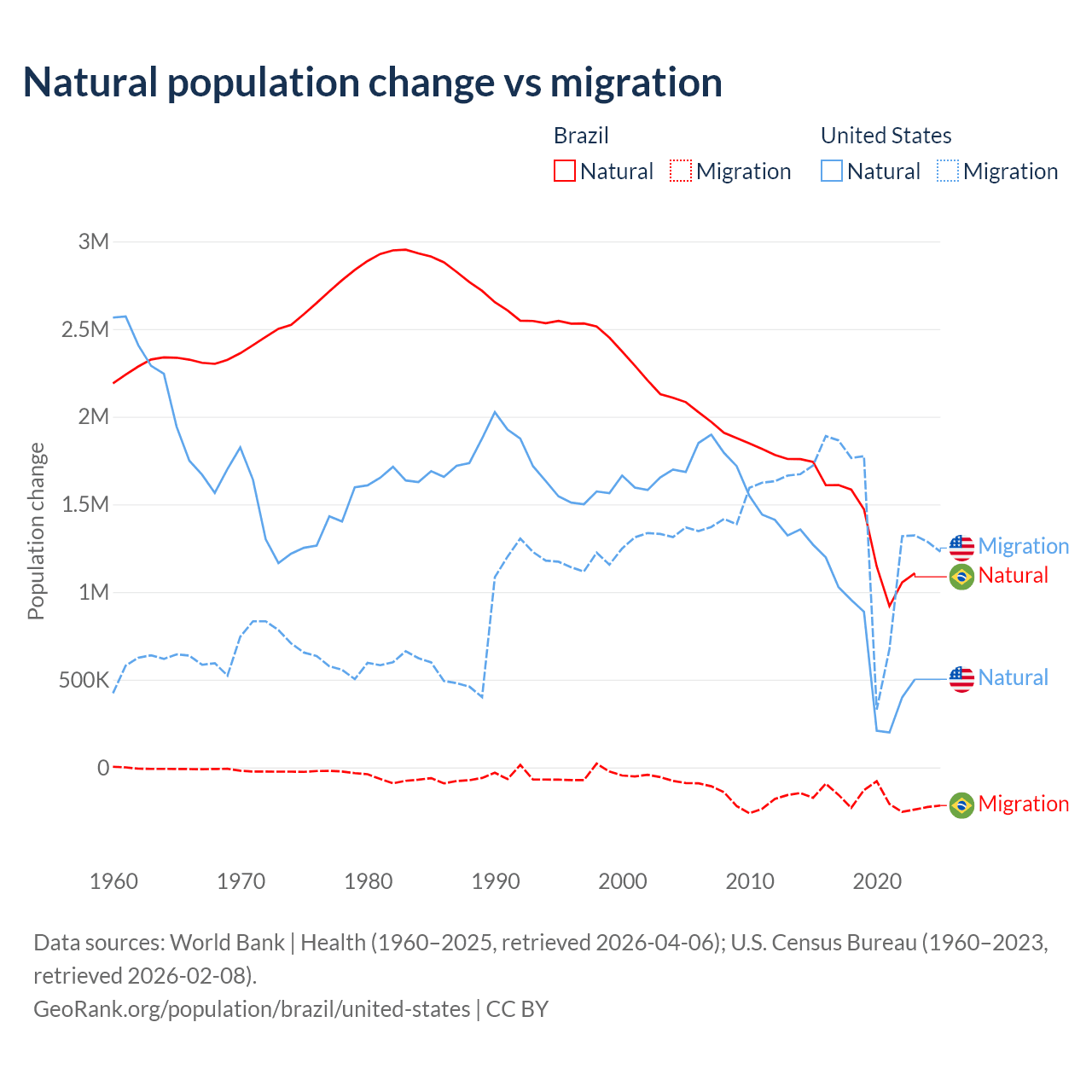 Over the last 10 years, 89.1% of the population change in Brazil is from natural causes (a gain of 14,004,164 people) and 10.9% is from migration (a loss of 1,708,894 people). In the United States 35.8% is from natural causes (a gain of 8,005,866 people) and 64.2% is from migration (a gain of 14,334,286 people).